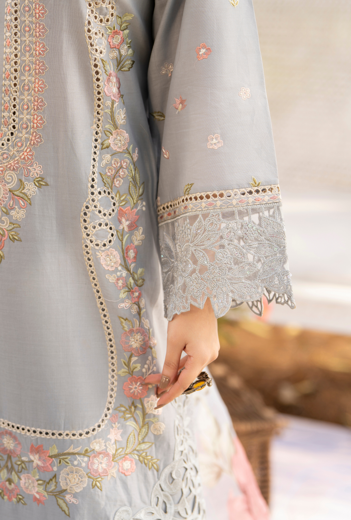 Long Boring Chikankari Shirt with Cut work Patches, Laces and Motives also Patches and